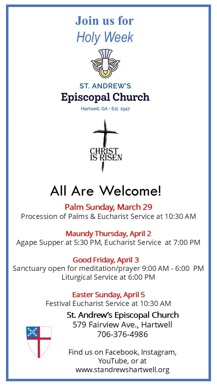 You are invited to join us for our weekly service of Holy Eucharist, either in person or online. After worship, we gather for fellowship in the Parish Hall.
